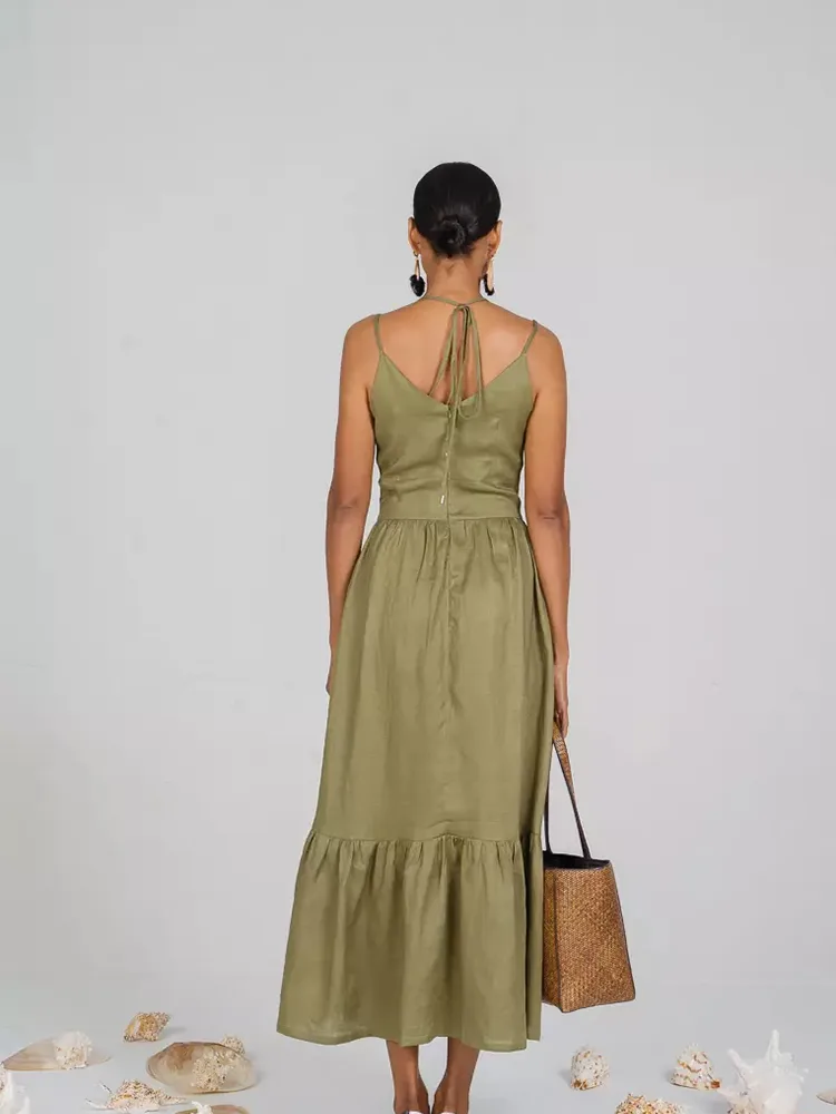 Vestido longo casual de linho feminino com decote em V profundo e características da moda